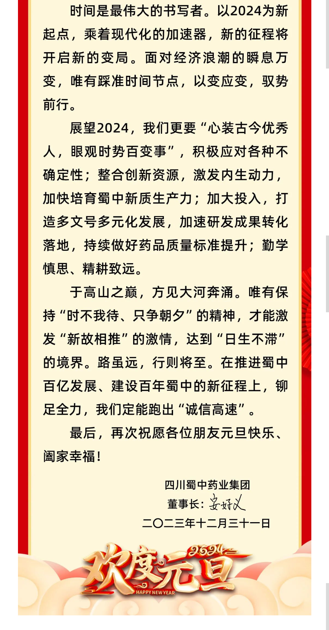 蜀中集团董事长二〇二四年元旦献词